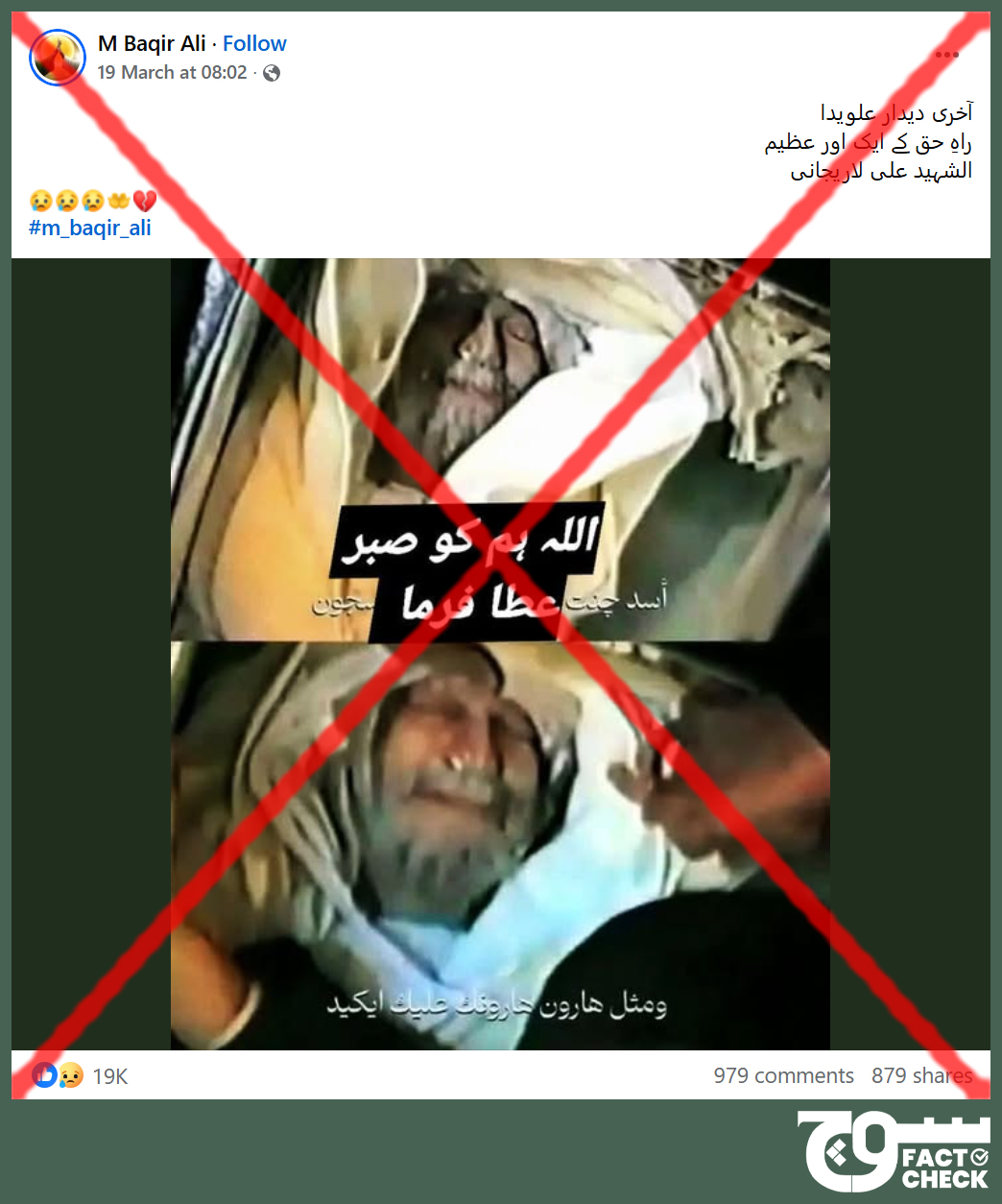 On 19 March 2026, Facebook user ‘M Baqir Ali’ posted (archive) pictures of what they claimed was the dead body of Iran’s Supreme National Security Council (SNSC) Secretary Ali Ardashir Larijani, who was assassinated by the US and Israel during the war that started on 28 February.