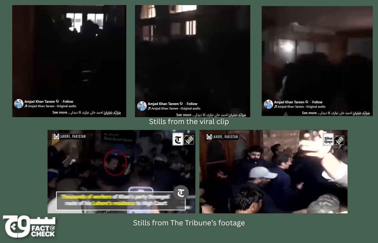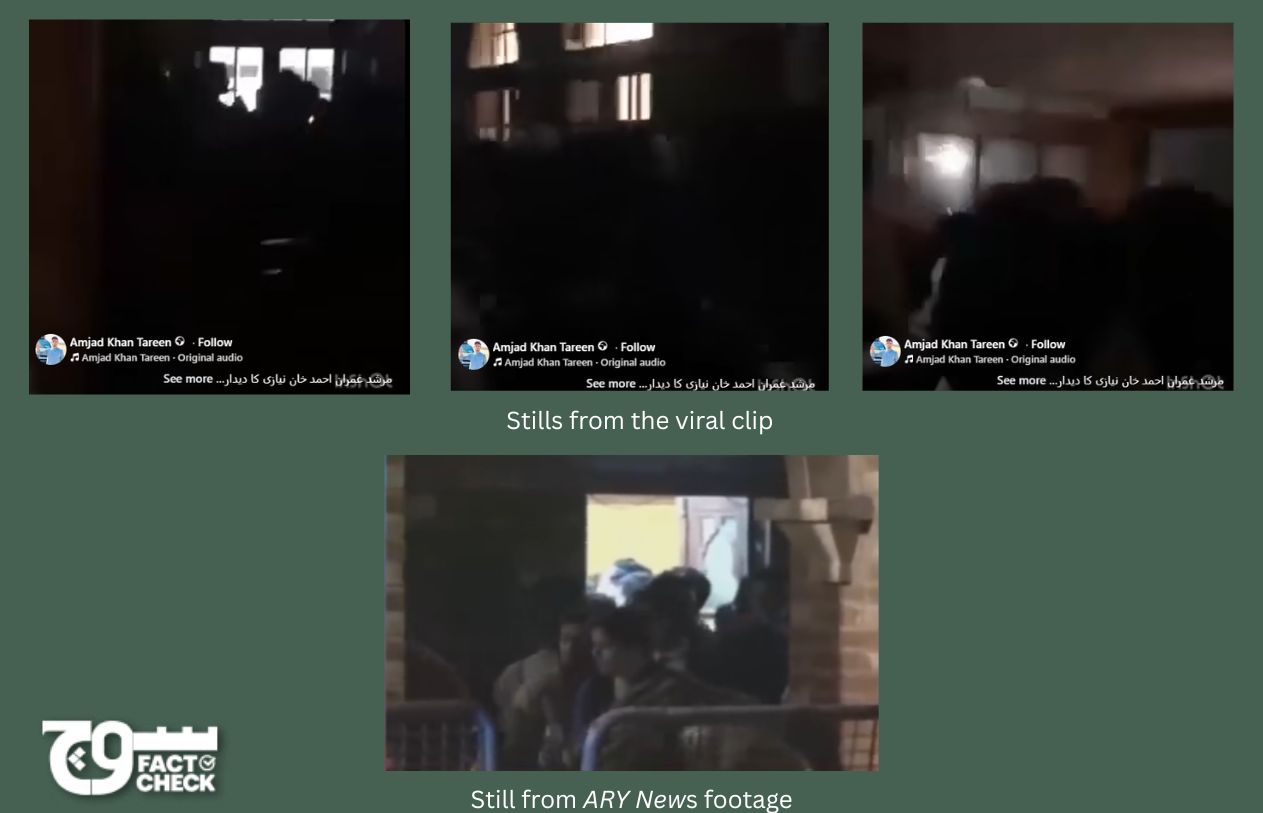 A side-by-side comparison of ARY News’ visuals and those in the viral clip show notable similarities including the location and Khan’s attire. It appears that the viral clip was filmed inside the court premises, while ARY’s footage shows the exterior of the court. This indicates that both videos were likely filmed during the same instance.