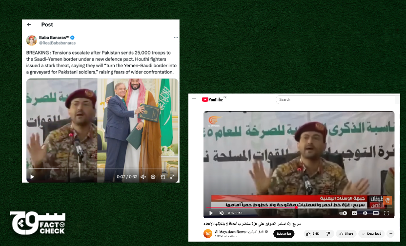 Soch Fact Check reverse-searched keyframes from the video in the claim and found the same clips of Yahya Sare’e, the spokesperson of the Yemeni armed forces, from 2024, confirming that the statement predates the signing of the Strategic Mutual Defence Agreement between Saudi Arabia and Pakistan in September 2025.