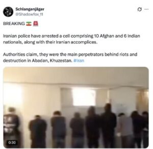 On 10 January 2026, an X account, @Shadowfox_11 posted a “BREAKING” claim alleging that Iranian police had arrested “a cell comprising 10 Afghan and 6 Indian nationals, along with their Iranian accomplices.” The post further asserted that authorities said the group were the “main perpetrators” behind riots and destruction in Abadan, Khuzestan. The claim was shared alongside a 30-second video showing several men standing in a line facing a wall, and the post had garnered 258.5K views at the time of the screenshot.
