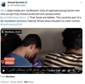 The same footage circulated on X shortly thereafter. On 10 January 2026, X user@Morteza_Avini shared the video, framing it as Iranian security forces arresting “key elements” involved in riots in Abadan and praising the actions of Iran’s security forces. The post did not mention Indians or any other foreign nationals. Later the same day, journalist Ahmed Quraishi shared a link to Avini’s X post with a longer version of the clip on X, describing it as Iranian state media airing “confession” footage of “captured young Iranian men.”