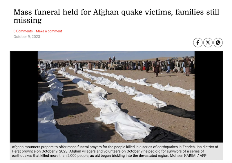 Screenshot of the Jamaica Observer carrying the photo depicting a mass funeral in Afghanistan in October 2023.