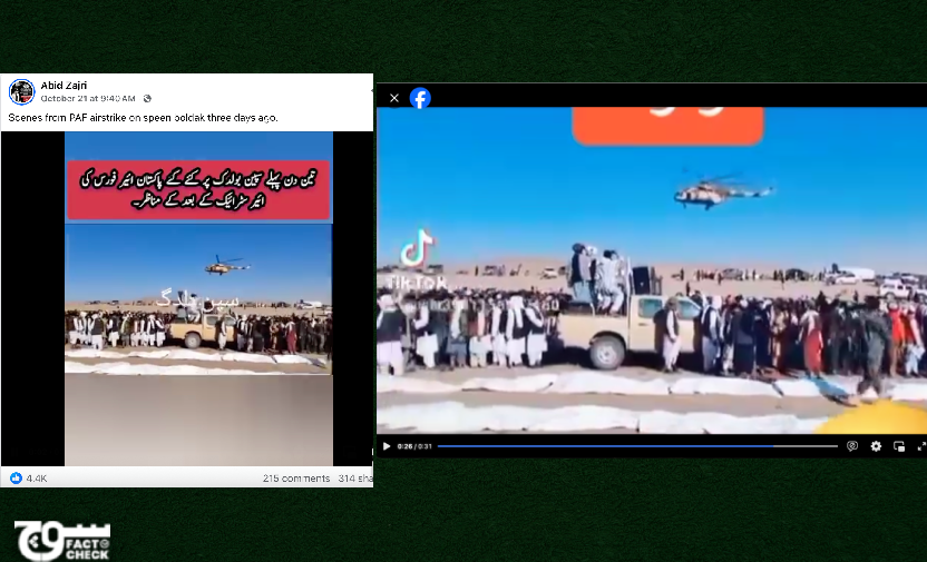 On 21 October, a Facebook user posted a video (archive) that apparently showed the aftermath of Pakistani airstrikes in Spin Boldak. The description of the post reads: “Scenes from PAF airstrike on speen boldak three days ago.”