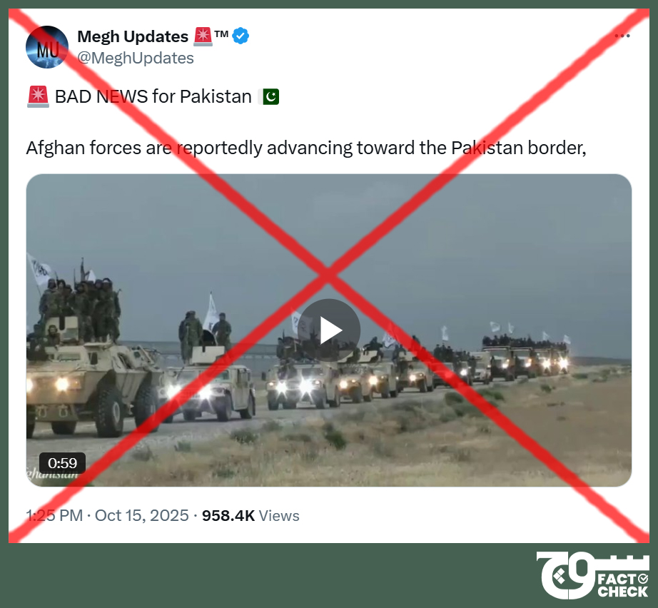 On 15 October 2025, X (formerly Twitter) account @MeghUpdates posted (archive) a video showing armed fighters of Afghanistan’s Taliban-led government allegedly moving towards the Pakistani border in military vehicles, including Humvees, while bearing the group’s flag.