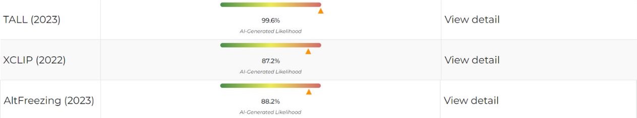 We used the TALL (2023) model as it focuses on checking online videos, which are often compressed or altered in ways that hide fine details. By testing whether the video remains coherent after details are removed, TALL helps reveal manipulation that may not be obvious to the eye. It rated the probability of the video being fake at 99.6%.