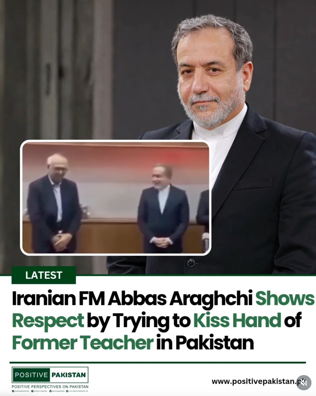 The video was posted by @positivepakistan.pk_on Instagram with the following embedded text: “Iranian FM Abbas Araghchi shows respect by trying to kiss hand of former teacher in Pakistan.”