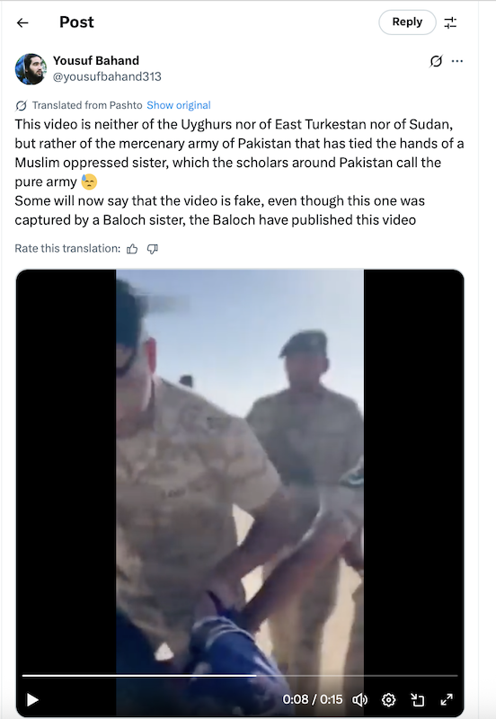 A video shared on X (archive) purported to show Pakistan Army soldiers forcibly removing a woman. The post included a claim in Pashto, with an English translation visible in the screenshot below: