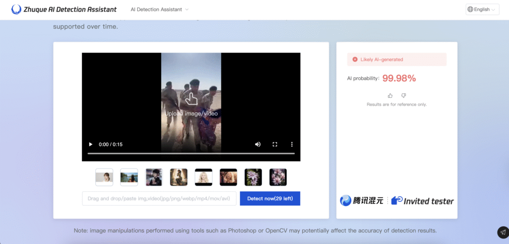Soch Fact Check also used AI detection tools for further analysis. One such tool, Zhuque AI Detection Assistant, yielded a probability of 99.98%, which means that the clip is “likely AI-generated”.