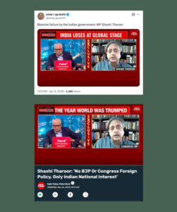 On 8 and 9 April 2026, users on X and Facebook shared a video of Indian politician Shashi Tharoor’s interview with news anchor Rajdeep Sardesai on India Today. A headline on the screen reads, “India Loses At Global Stage.”