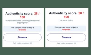 The second phrase showed an even lower authenticity score i.e. 20/100, indicating that the sampled voice is “likely a deepfake.”
