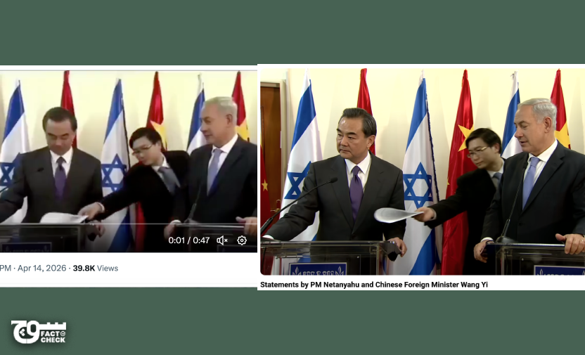 Although the clip shows Yi returning the paper handed to him by someone who appears to be a staff member, right before he spoke, the complete press conference does not include any instance of the Chinese leader reprimanding the Israeli prime minister.