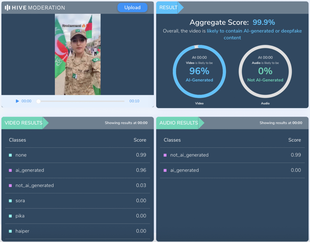Soch Fact Check then ran the clip through multiple AI detection tools, which confirmed it is fake. Hive Moderation gave the video an aggregate score of 99.9%, indicating that “overall, the video is likely to contain AI-generated or deepfake content”.