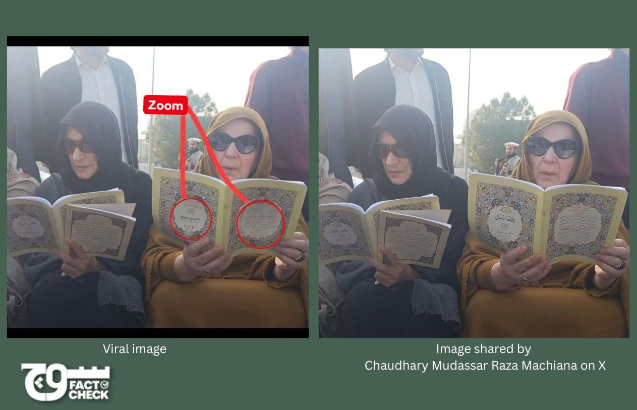 On 4 February, Facebook user “Tigre Pmln” shared an image of PTI’s founder Imran Khan’s sisters Uzma Niazi and Noreen Niazi, holding a Quran upside down, with the caption: “استغفراللہ استغفراللہ