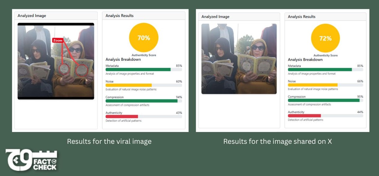 A side-by-side comparison of both images shows they are identical in composition, background, lighting, and positioning, with one key difference:; in the viral version, Noreen Niazi appears to be holding the Quran upside down. No other visual elements differ between the two images, indicating that only this specific portion was modified rather than the entire image being recreated.