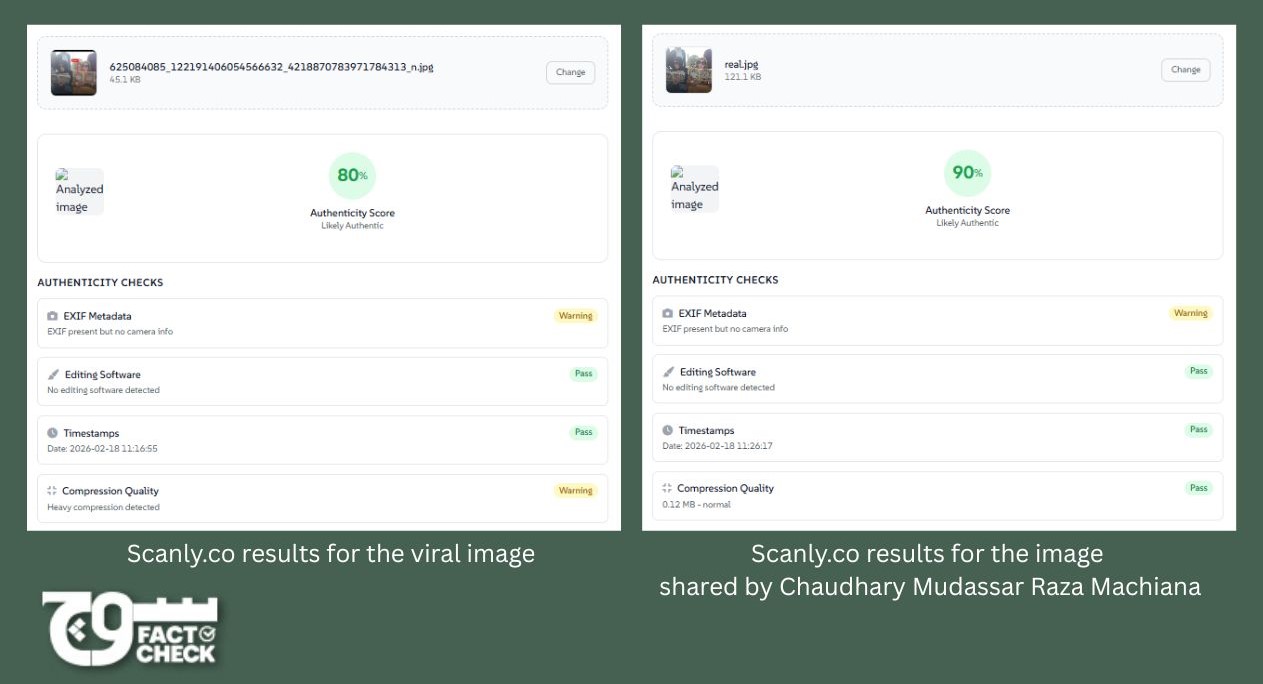 We also analysed both versions using Scanly.co, which is an online photo authenticity tool that analyses an image’s metadata, timestamps, compression patterns, and file structure to identify signs of editing or recompression. The viral image received an 80% authenticity rating and generated a warning under EXIF metadata stating: “EXIF present but no camera info,” meaning the file contained metadata but lacked original device details. This is a common sign of re-saving or processing. The tool detected no editing software and marked timestamps as valid (dated 18 February 2026, 11:16:55), but flagged compression quality with a warning. This indicates that the image had been recompressed. Recompression is consistent with an image being modified and then re-exported.