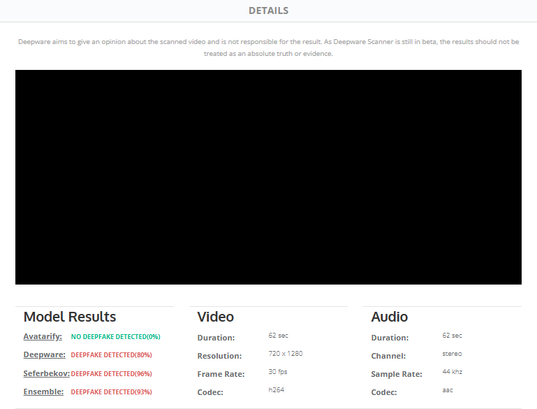 Out of the four models, three indicated a high likelihood of tampering. The deepware model, which analyses facial inconsistencies, unnatural blinking, distortions, and audio-visual mismatches, gave an 80% rating that the video is a deepfake. The Seferbekov model examines frame-level anomalies, especially in facial texture, lighting, and blending artifacts. This model rated the clip 96% strongly indicating the video is a deepfake.