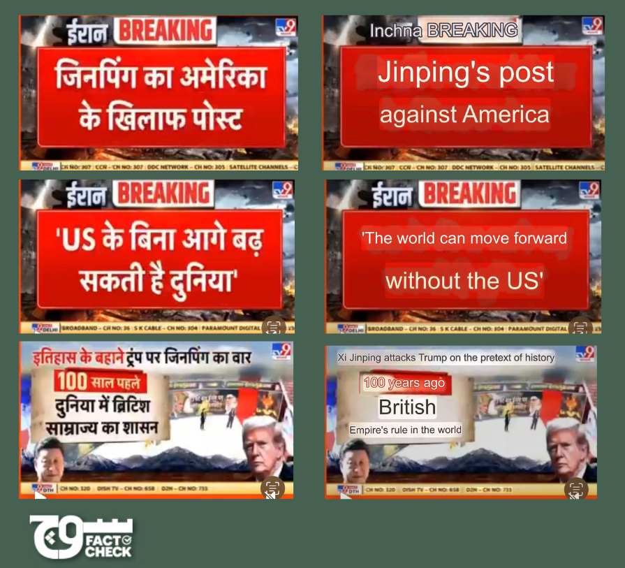 Crucially, the Hindi text in the clip does not mention Pakistan. Using Google Lens to translate, we found that the headlines reference Xi Jinping, Donald Trump, and the US.