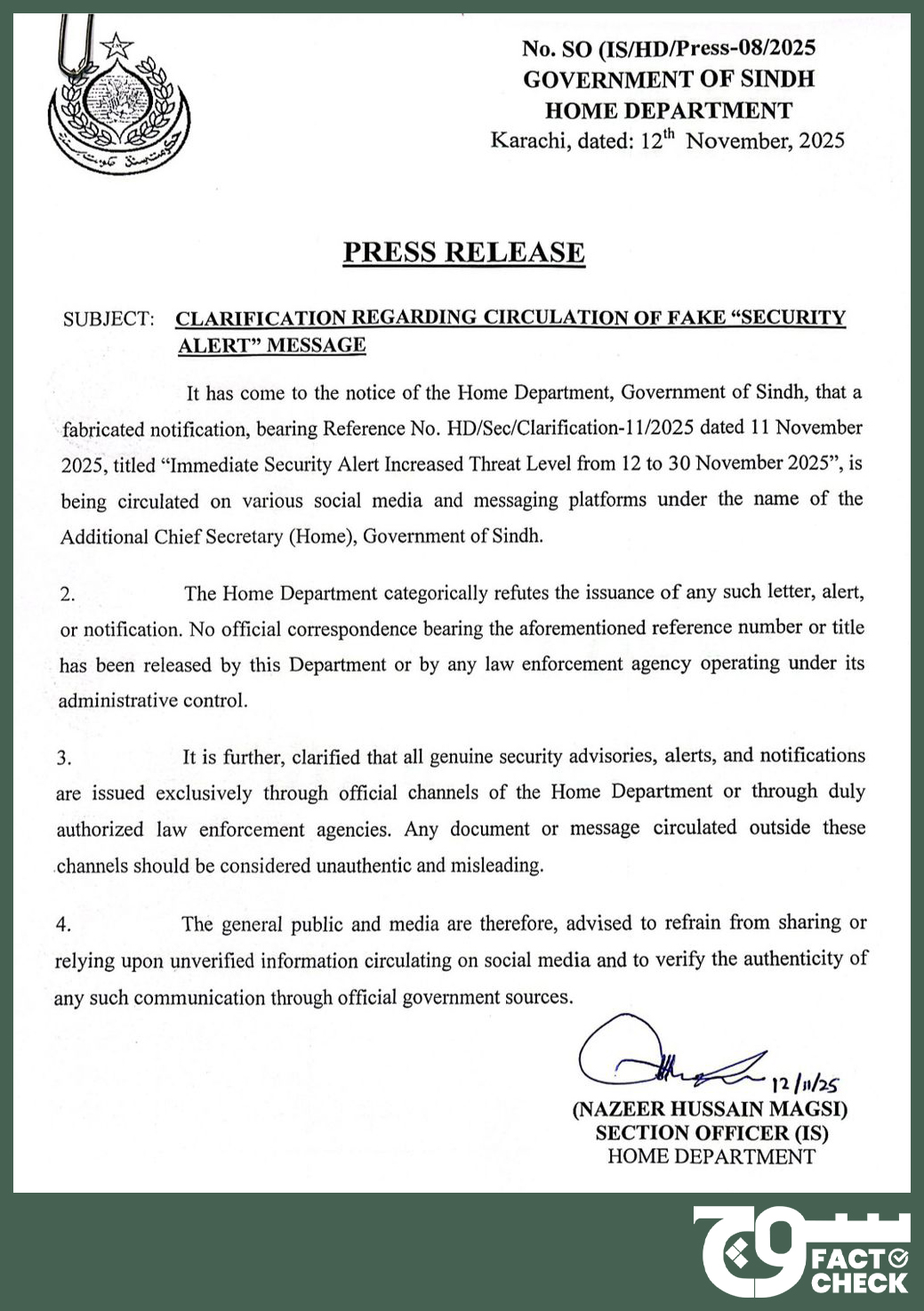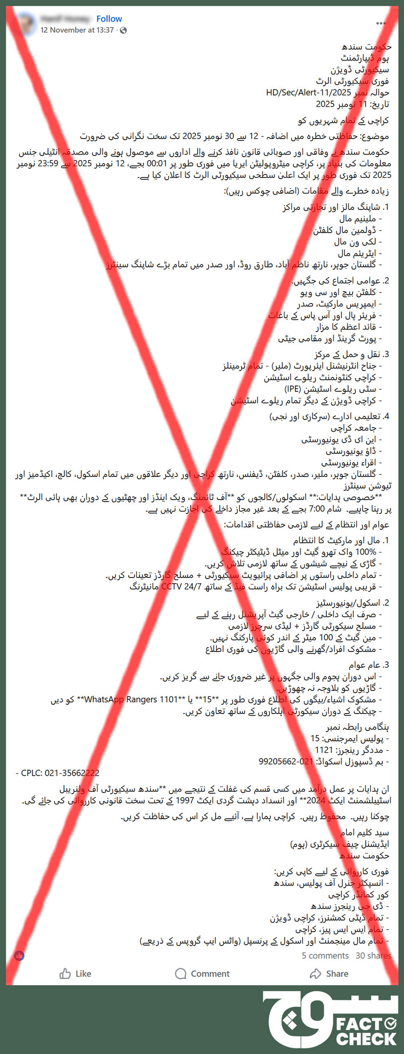 On 12 November 2025, multiple social media posts claimed that the Government of Sindh has issued a “high-level security alert” for Karachi Metropolitan Area from 12 to 30 November 2025, based on credible intelligence reports, which advised citizens to “stay alert, stay safe” (archived here, here, here, and here, respectively).