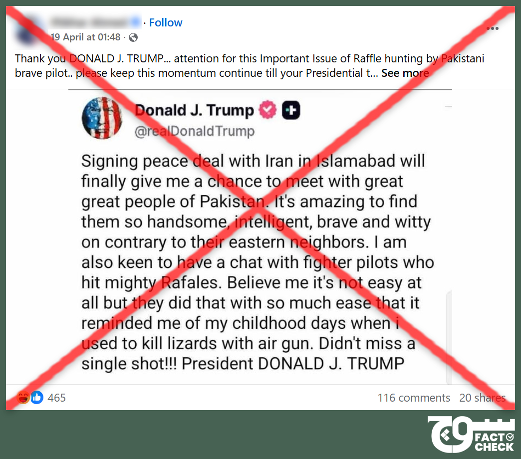 Claim: In a Truth Social post about possibly travelling to Islamabad to sign a deal with Iran, US President Donald Trump praised Pakistanis as “handsome” and “intelligent” compared to their “eastern neighbors” — Indians — and expressed a desire to meet the fighter pilots who “hit mighty Rafales” during the May 2025 conflict, comparing the accomplishment to “killing lizards with an air gun” in his childhood.