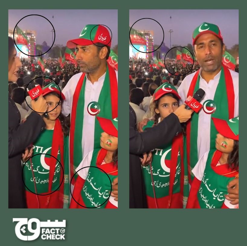 The logo visible on the microphone also appears on the PTI supporter’s cap. Such repetitions are common in AI-generated visuals as generative models often replicate prominent visual elements across different objects when attempting to maintain consistency within a scene.