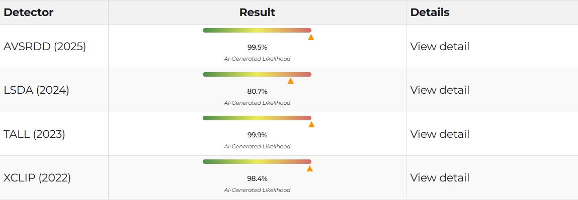 We first used the AVSRDD (2025) model, which is an AVSR-based audio and visual deepfake detection method that leverages speech correlation. The model uses dual-branch encoders for audio and video to support independent detection of each modality. It rated the likelihood of the video being fake at 99.5%.