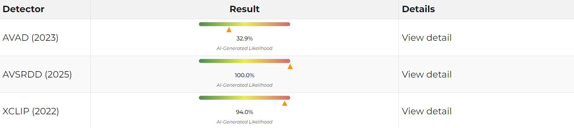 Soch Fact Check then analysed the video using DeepFake-O-Meter, developed by the University at Buffalo’s Media Forensics Lab. From the available detectors, we used three, namely AVAD, AVSRDD, and XCLIP. They revealed that the probability of the video in question being AI-generated was 32.9%,100.0%, and 94.0%, respectively.