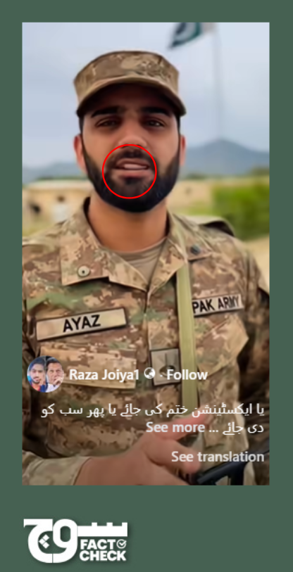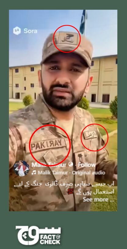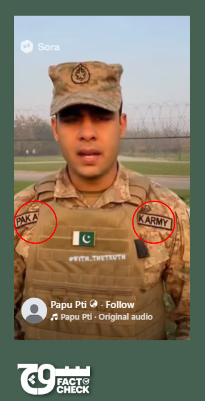 In the third video, the tag on the soldier’s uniform (on the left side of the frame) shows the alphabets RAY written in reverse. This indicates that letters were scrambled. The tag on the right appears to be in Urdu. Even the logo on the soldier’s cap looks warped, suggesting AI manipulation. In particular, AI models are trained on millions of images but don’t actually understand letters or words as distinct objects. They learn that text-like shapes often appear in certain places, such as on signs or posters, and try to mimic those patterns. As a result, the text they generate usually looks real at first glance but appears distorted or incorrect when examined closely.