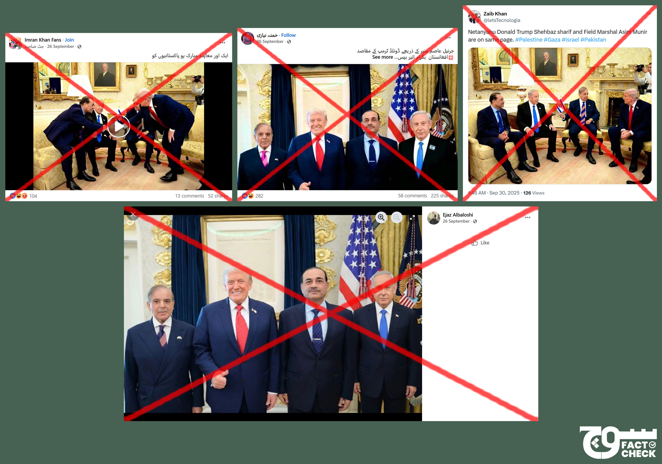 In late September 2025, social media users posted videos and images showing Israeli premier Netanyahu present at a White House meeting between US President Trump and Pakistani leaders, including PM Sharif and Field Marshal Munir. The four allegedly shook hands and posed for pictures (archives 1, 2, 3, 4).