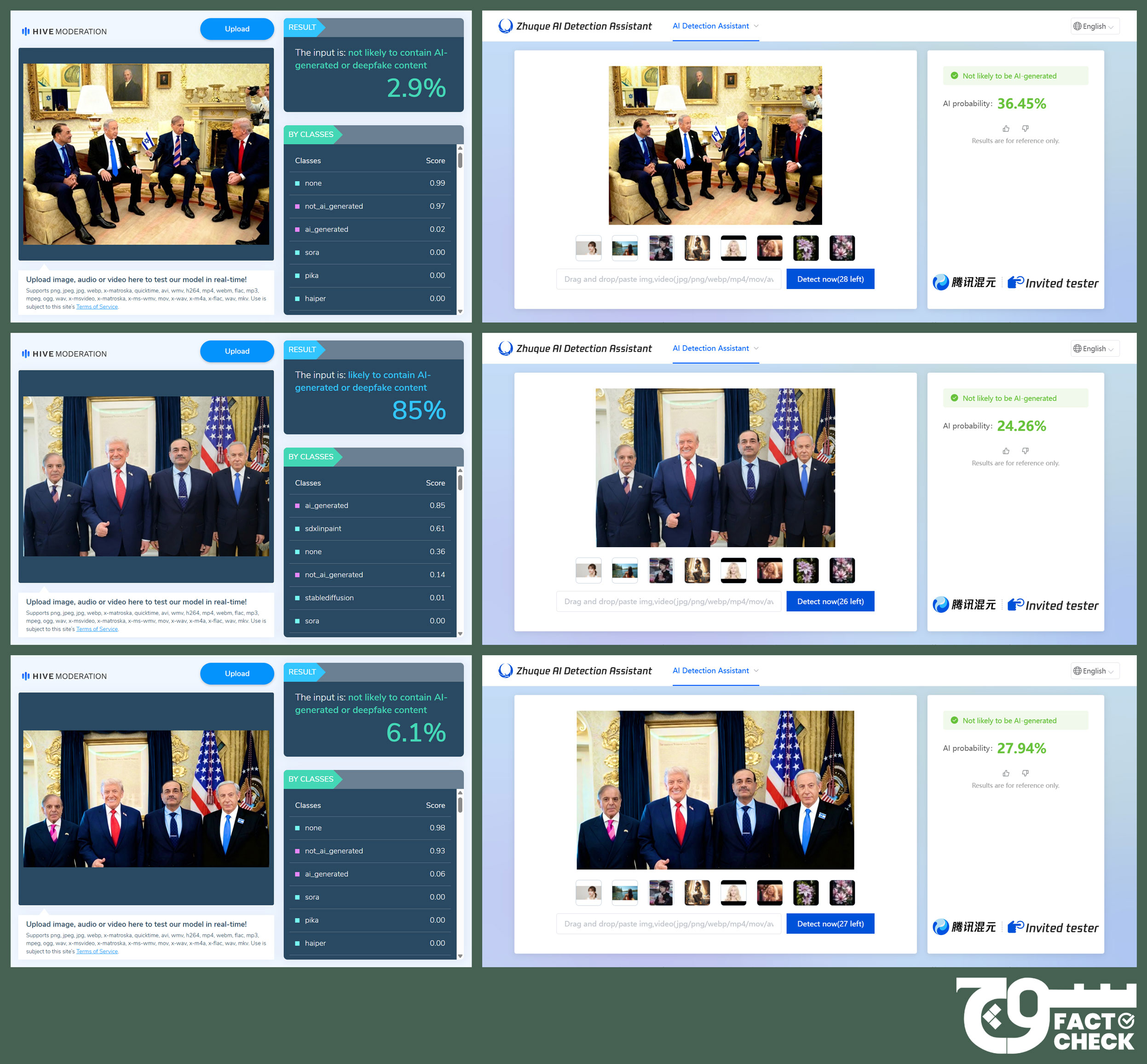 Probabilities of the three images being AI-generated using Hive Moderation (left) and Zhuque AI Detection Assistant (right).