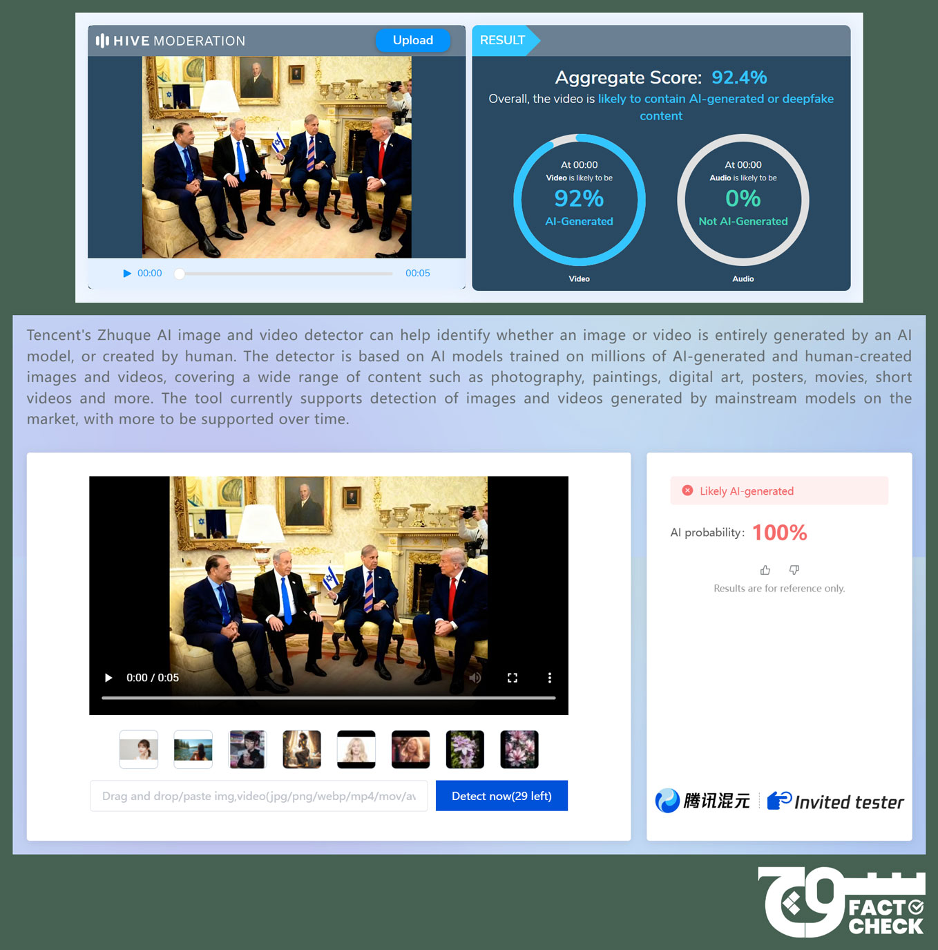 Probabilities of the video being AI-generated using Hive Moderation (top) and Zhuque AI Detection Assistant (bottom).